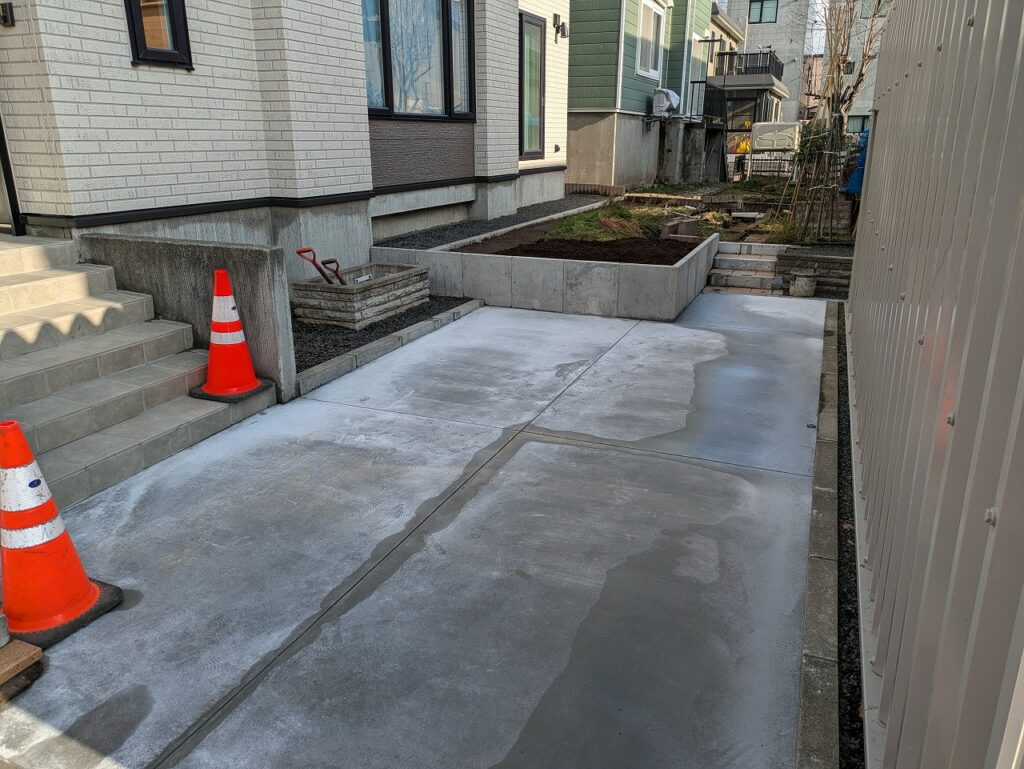 玄関ポーチのタイルを張替え、アスファルト舗装を撤去して土間コンクリートを打設、畑スペースに土留めの設置を実施しました。